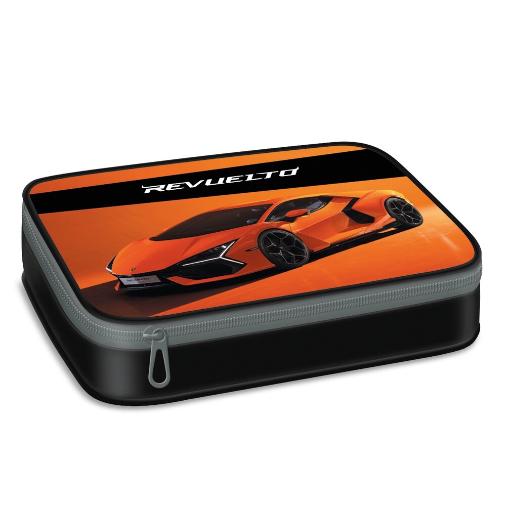 Lamborghini Sian mintájú, többszintes, töltetlen, cipzáras tolltartó. Belül nyomott mintás textillel bevont merev lapokkal, gumis kialakítással az írószerek tárolásához és egy cipzáras belső zsebbel. Méret: 155x225x45 mm