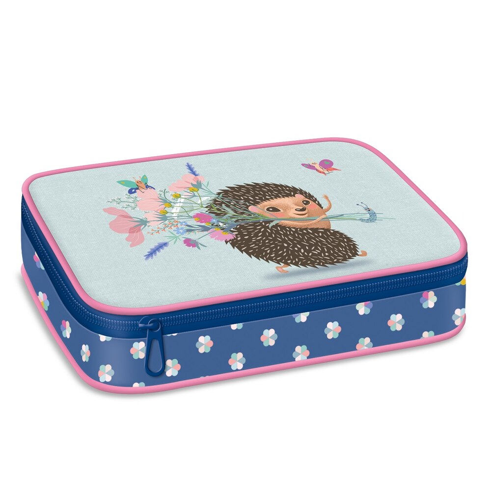 Többszintes, töltetlen, cipzáras tolltartó. Belül nyomott mintás textillel bevont merev lapokkal, gumis kialakítással az írószerek tárolásához és egy cipzáras belső zsebbel. Méret: 155x225x45 mm