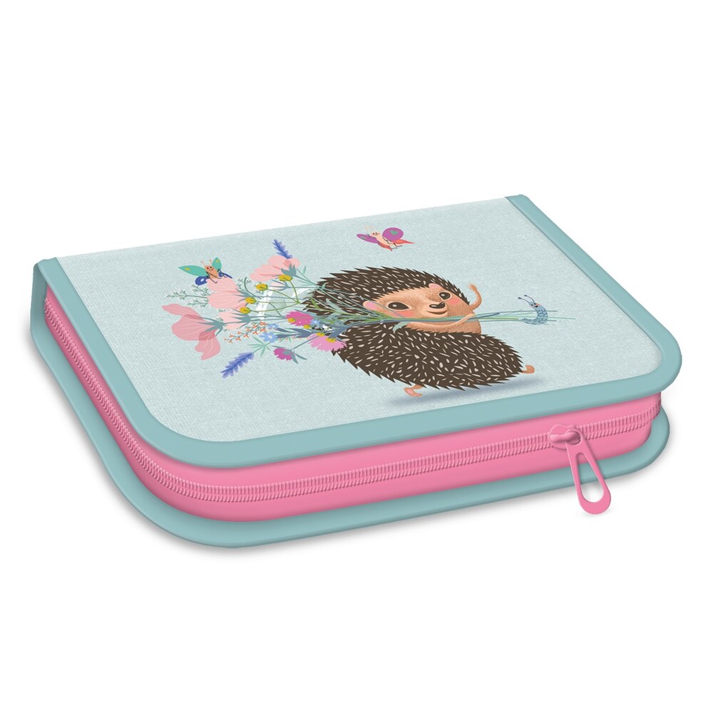 Jó minőségű írószerekkel töltött tolltartó, két kihajtható füllel. Tartalma: 10 db színes ceruza, 2 db 2B, 1 db HB grafit ceruza, 8 db filctoll, 1 db 15 cm-es egyenes és 1 db 9x9 x11 cm-es derékszögű vonalzó,1 db betű- és számsablon, hegyező, radír, órarend A és B hétre. Prémium minőségű SBS cipzárral ellátott. Méret: 135x195x35 mm